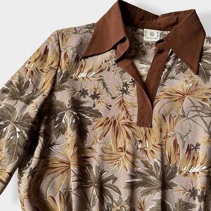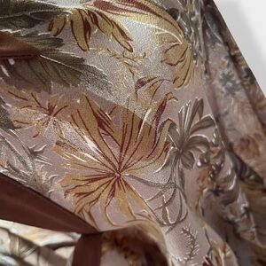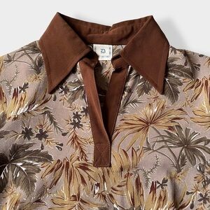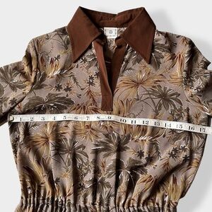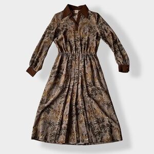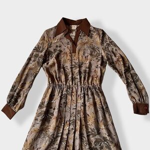 Late 60s-early 70s vintage crepe pleated long sleeve dress in earthtones with leaves print. Brown, tan, ochre tones with milk chocolate brown collar and cuffs. Elastic waist. Released pleats front and back in the middle part. Lined thru the skirt. No lining on top. Has a matching belt.