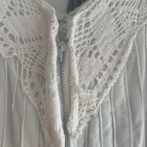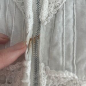 This 1970s Mexican wedding dress is just such a pure delight and the optimum of femininity! Chris White Cotton with rose of Pinto and scallop lace, a front and back V-neck, a gathered waist skirt with lace panels and tiered lace sections. The upper sleeves with beautiful crocheted lace are gathered with flouncy lace. The center back of dress has a lapped metal, zipper, and a hook and eye closure.