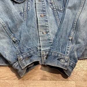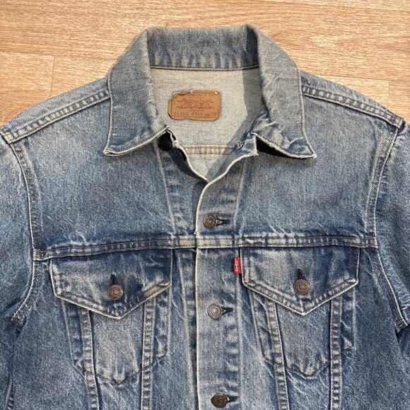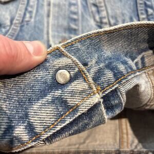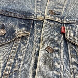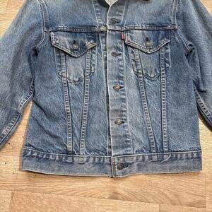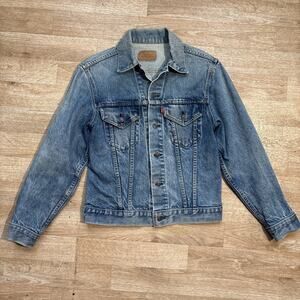 Beautifully faded levis Jean jacket. There are some stains, marks, and signs of wear throughout the jacket. This was definitely well loved and making it a truly unique garment.