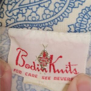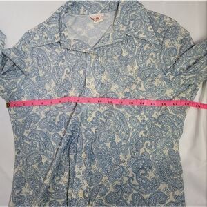 Vtg 1970s Bodin Knits pointed disco collar button up blue paisley print shirt. No size or materials tags, please refer to measurements for fit. Most likely polyester or polyester blend.