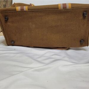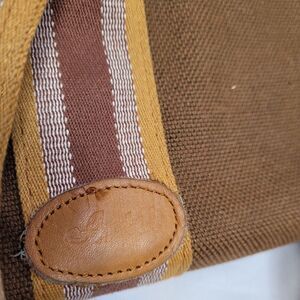 Vtg 1970s Artel canvas tote duffel carry on bag. Some minor wear shown in photos. Great for carrying lots of things! Brown with yellow and white detail.