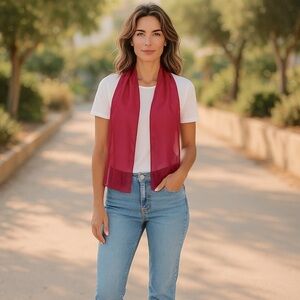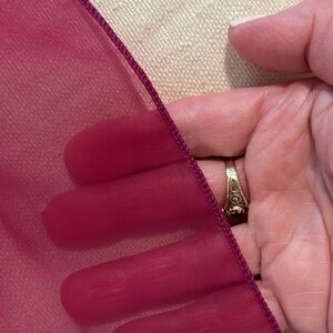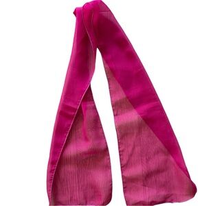 Silk Chiffon 39.5 x 7 Vintage long scarf beautiful Pink Raspberry with stitched edge detail. This may be a silk blend chiffon, but I’m not sure. Great condition. Perfect for fall travel. 1 owner. My mom. Model is virtual.