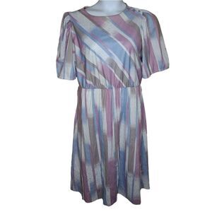 Vtg 1970s Sandi Dee pastel stripe fit and flare short sleeve day dress. Please examine photos carefully, this has a lot of wear. His would be great for a DIY project! Polyester