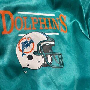 VINTAGE 80’ RETRO BOMBER SATIN JACKET NFL MIAMI DOLPHINS TEAL/ORANGE SIZE L