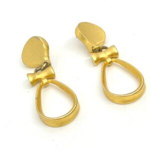 Beautiful VINTAGE MODERNIST GOLD EARRINGS DUO — featuring one pair of bold geometric square-and-circle dangle clip ons and one pair of elegant teardrop hoop pierced earrings with a sculptural design reminiscent of ANNE KLEIN from the 1980s–1990s. Both pairs have a rich matte brushed gold tone with subtle patina, adding to their vintage charm. Each measures approximately 2" and 2.5" long. The teardrop pair is pierced; the geometric pair is a clip-on. Some surface scratches and minor plating wear on the back (as shown), but this does not detract from their wearability or beauty. Unsigned but beautiful, perfect for any vintage 80s jewelry lover or statement earring collector.