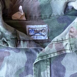 VINTAGE 80S 90S FIVE BROTHER CAMO BUTTON UP SHIRT GREEN OUTDOORS MENS MEDIUM beautiful color measurements, and tag shown in pictures item is preworn and may have defects shipping every wednesday and sunday