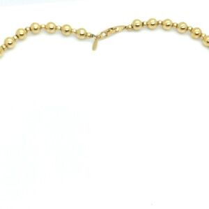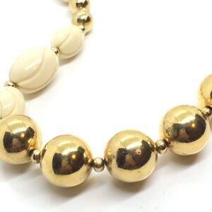 Beautiful VINTAGE 80S 90S NAPIER GOLD TONE CARVED ACRYLIC BEAD BAUBLE NECKLACE BEADED. Creamy ivory carved acrylic oval shaped beads paired with gold tone round beads. Fold over clasp. Signed Napier. Measures approximately 27” around. Great vintage condition with some light gold tone plating loss on some of the beads but very minor and does not deter from wear or the beauty of this piece.