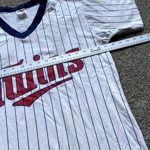 VINTAGE 80S KENT HRBEK #14 MINNESOTA TWINS STRIPED BASEBALL JERSEY SINGLE STITCH This vintage Kent Hrbek "Herbie" Minnesota twins jersey is in good pre-owned and vintage condition. It has some signs of wear as shown in the pictures, but no holes or rips. The shirt is single stitched and double-sided Size large - please see pictures for measurements.