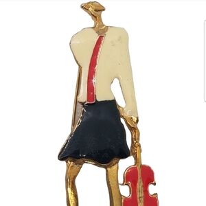 Lovely modernist style goldtoned and enamel brooch from the 1980s featuring a fashion conscious violin performer. Brooch is goldtoned with cream,black and red enamel detail.  Brooch measures 2-3/4 inches tall and 1-1/8 inches wide.  Brooch is in good condition with some scratches to the black enamel on the skirt of brooch as seen in pics.