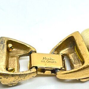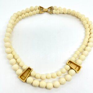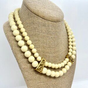 Beautiful VINTAGE 80S NAPIER CREAM GOLD TONE NECKLACE ETRUSCAN MULTI STRAND ACRYLIC BEAD. Signed Napier on the fold clasp. Creamy off-white double stranded graduated acrylic beads paired with antiqued gold tone Etruscan Revival swirl findings. Measures approximately: 16" around the neck, 1" at its widest. Great condition with some darkened patina on the gold tone but does not deter from wear or its beauty.