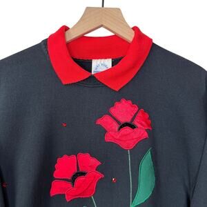 VINTAGE 80s Applique Sweatshirt Size M Floral Rhinestone Grannycore Cottage