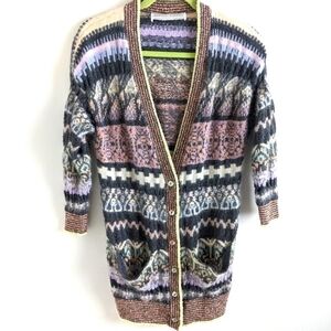 Beautiful patterns run through this sweater. A mix of fibers and yarns. Some of them are like an angora and fuzzy soft and some are flat.