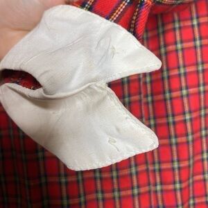 Condition: Gently used, one wrist button missing and some imperfections on the white cuffs.