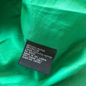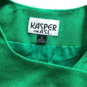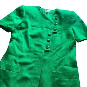 Short sleeve off-set button front power suit shift dress in vibrant Kelly green. Shoulder padding. 2 front pockets. Textured poly/rayon blend shell. Fully lined. Made in Sri Lanka. 39” length, 18.5” pit-to-pit. Women’s size 8.
