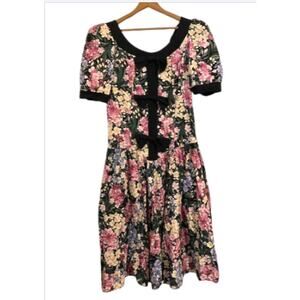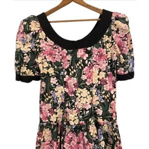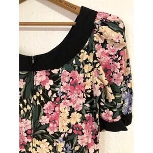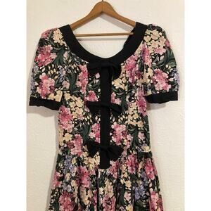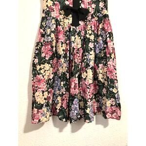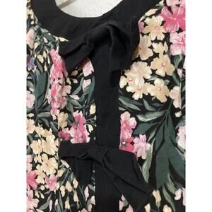 This is an adorable floral dress straight from the 80's. Black with a lavender and pink floral pattern all over. Black neckline and sleeve trim. Drop waistline. 3 large black bows in front. 2 small shoulder pads. One small black button on each sleeve. Zipper in back. In gently used, excellent condition.