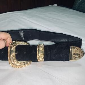 EIGHTIES VELVET BELT (LEATHER BACKED) BY JILL STUART WITH LARGE GOLD BUCKLE AND MATCHING TIP . 1 1/2" WIDE. 33" LONG. NEVER WORN BUT LEATHER BACKING IS A BIT STIFF FROM STORAGE.
