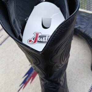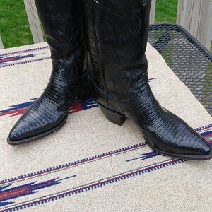 Fabulous & Stylish, these Justin brand black Iguana lizard vamp with stitched leather upper boots look great on and are in almost new condition from the mid-80's. Quality made in USA.