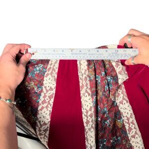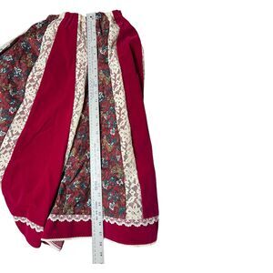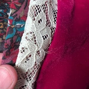 A beautiful dancing skirt with rich oxblood velvet and cream lace. The waist is small but has several inches of stretch, see photos for reference. In excellent condition with no flaws noted.