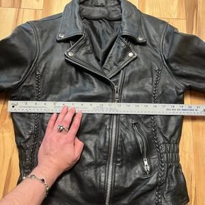 A good condition heavy biker jacket with braided leather accents. Has some wear on the high cuffs. It is also missing the original liner.