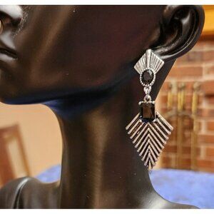 VINTAGE 80s Silver Tone Pierced Drop Earrings Black Glass Art Deco Statement