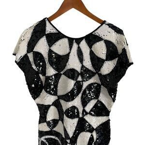 VINTAGE 80s TADASHI Sequin Mod Midi Dress. A total showstopper! Unique abstract geometric print throughout. Completely covered in hand-sewn sequins. Unlined. High scoop neck and low v-back detail. Back zipper. Fabric has a good amount of stretch and the dress could either be worn form-fitting or lose and oversized. Marked a VINTAGE size 14, but fits more like a modern L or 8/10. Refer to measurements and note that there is a good amount of stretch/give.
