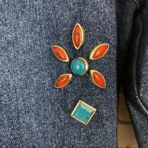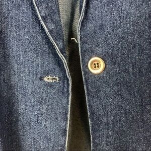 This stunning dark wash denim blazer features beautiful crackle stone embellishments in blue and red. It also features a single button closure as well as gorgeous concho embellishments with suede leather ties.