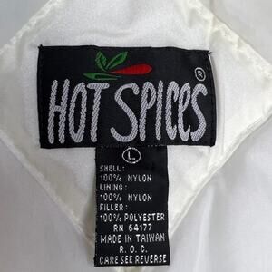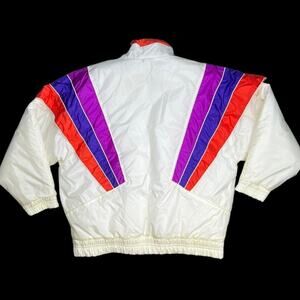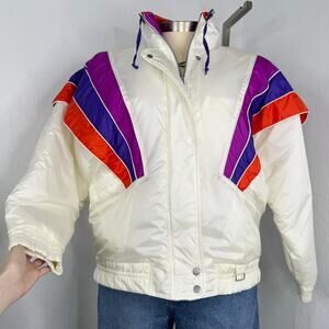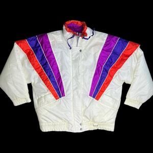 Vintage 80s Ski Jacket Winter Coat White with Bright Purple and Orange Stripes. It has Shoulder Pads, Size Large, Hot Spices Brand, and is in very good vintage condition with just a few tiny specs on the hem. In the photos, you can see what looks like yellowing in some areas; it's the underside double layer showing through, not staining. Two pockets on the outside, one on the inside.