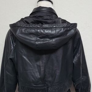 Vintage 80s Zenia Black Leather Hooded Tie-Waist Thermolite Lined Layered Jacket.