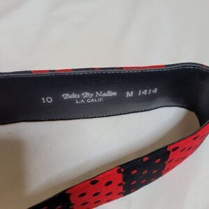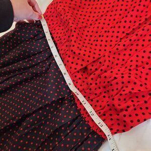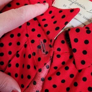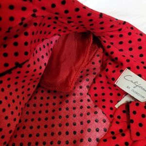 Vtg 1980s California Design by Dorothy Samuel polka dot red and black long sleeve shirt dress with belt. Please refer to measurements for fit. Minor spot shown in photo. Rayon.
