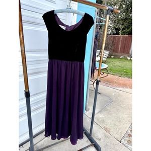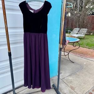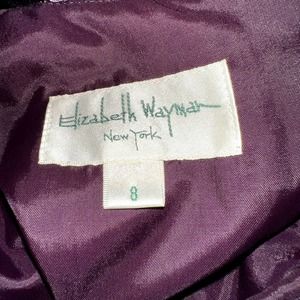IMPECCABLE CONDITION EIGHTIES DRESS FROM ELIZABETH WAYMAN. SKIRT IS DEEP PURPLE 100% SILK, BODICE IS SILK BLEND VELVET. SASH TO TIE IN BACK OR FRONT. MEASUREMENTS IN PHOTOS (18" UNDERARM TO UNDERARM; LENGTH 53" IN FRONT, DIPS SEVERAL INCHES IN BACK). SIZE 8