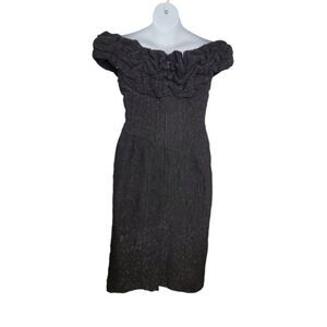 VINTAGE 80s black dress off shoulder embossed gathered cocktail M