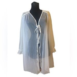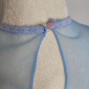 Vtg 1980s blue lace cutout sheer side full length nightgown. Beautiful details, perfect for a wedding night. Powder blue, marked size large, please refer to measurements. Nylon rayon polyester.