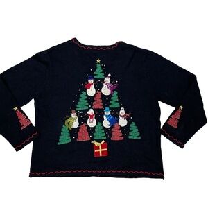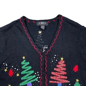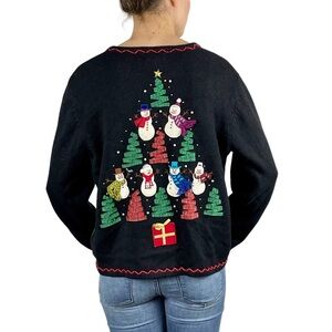 VINTAGE 90S COTTON CHRISTMAS TREE SNOWMAN HOLIDAY CARDIGAN SWEATER SEQUE NOEL