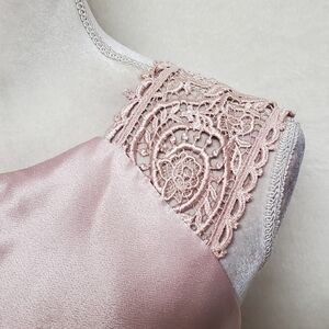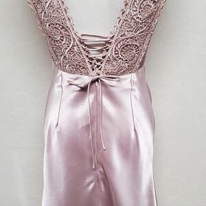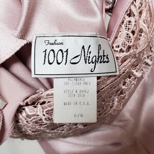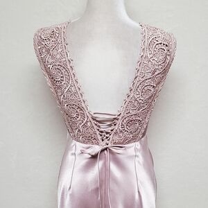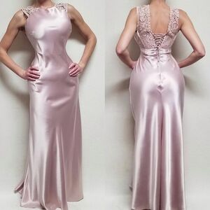 VINTAGE 90s 1001 Nights Blush Pink Satin Crochet Panel Lace-up Back Maxi Dress 6