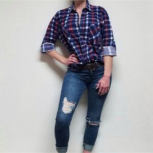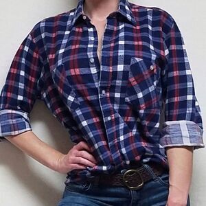 Vintage 90s American Edition Red White Blue Plaid Flannel Button Up Western Shirt.
