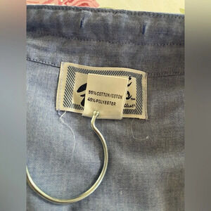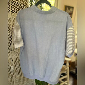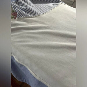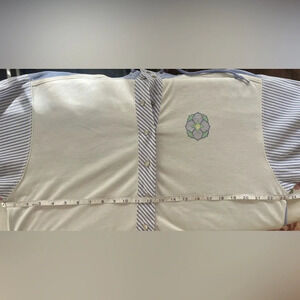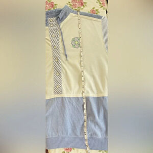 Loving this coastal grandmacore collared pullover! Size Large and can be worn by itself or layered. Nice blend of 55% cotton and 45% polyester. The blue & white striped sleeves are relaxed and fit to the elbow. The sleeve, back, and lower front portion of the shirt is a a lightweight chambray weave, and the top front is more of a sweater feel. Please note the adorable floral emblem and imitation pearl snaps! All snaps are in excellent condition and function well. I added some close ups of light piling to assist you in your purchasing decision.