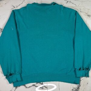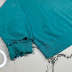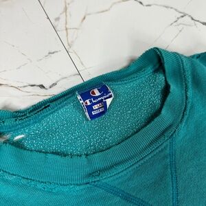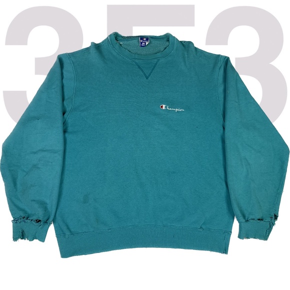 Vintage 1990s Champion Crew Neck Sweatshirt. Sz XL Teal Blue. THRASHED! Incredible Fade and Wear. Champion Tag. Great Piece