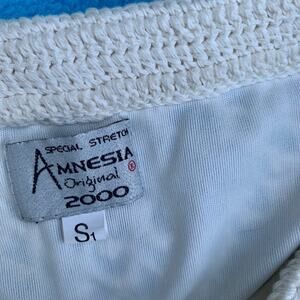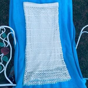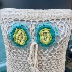 VINTAGE CROCHET DRESS OR SKIRT MADE IN FRANCE. WHITE WITH BLUE/GREEN GRANNY SQUARE FLOWERS. WEAR AS A STRAPLESS DRESS OR A SKIRT. NEVER WORN BUT STORED SINCE THE NINETIES.