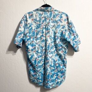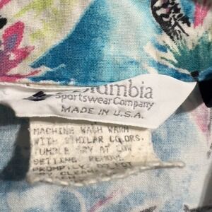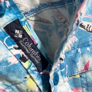 VINTAGE 90s Columbia Fly Fish Button Down Short Sleeve Shirt Mens Blue Colorful