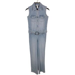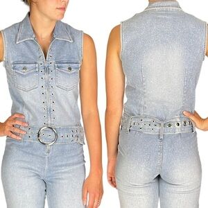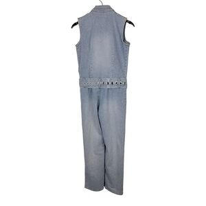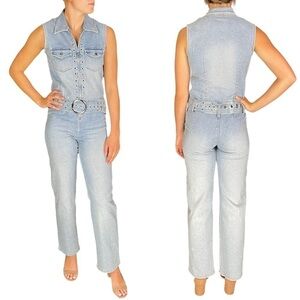 VINTAGE 90s DENIM JUMPSUIT BELTED SLEEVELESS LIGHT WASH FITTED - FASHION BUG