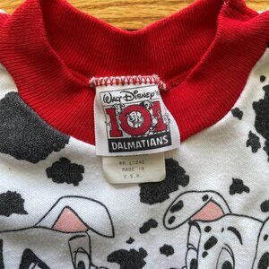 VINTAGE 90s Disney Outfits- Bundle of 2 Outfits Short sleeve tee and matching shorts Size 4T Winnie the Pooh & 101 Dalmatians Winnie the Pooh: White with pink flowers, pink collar on shirt, Winnie the Pooh holding flowers on front of shirt 65% polyester, 35% cotton Waistband measures approximately 7" when laying flat but very stretchy Shirt measures approximately 12.5" pit to pit 101 Dalmatians: White with black dalmatian spots, collar is red, two dalmatians holding red heart of front of shirt 50% cotton, 50% polyester Waistband measures approximately 9.25" when laying flat Shirt measures approximately 13.5" pit to pit Both outfits are slightly faded/pilled from being well-loved as seen in photos but plenty of life in them; can tell garments have been washed a lot but still good condition Comes from smoke free/pet free home