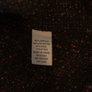 Features: Chocolate brown heathered fleck orange textured tweed knit long sleeve zip front pointed collared jacket.