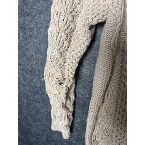 This is a pre-owned, vintage item. The right sleeve cuff has noticeable damage, including fraying and holes, as shown in the close-up photo. The rest of the sweater is in good vintage condition.