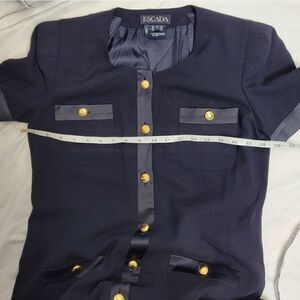 Vtg 1990s Escada by Margaretha Ley navy blue pleated wool drop waist dress with gold buttons. Definitely something The Nanny Fran Dresher would have worn! Fully lined, amazing quality. Marked a 36, I have included the official Escada size chart, but please refer to measurements. Dark academia. Made in Switzerland.