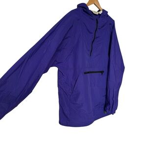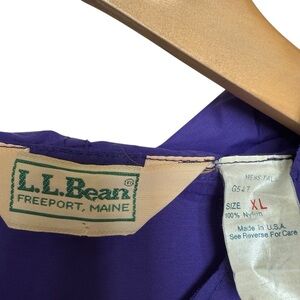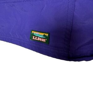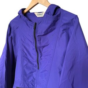 Keywords: L.L. Bean, vintage jacket, 90s fashion, purple anorak, men's outerwear, retro style, casual wear, travel jacket, lightweight nylon, adjustable hood, half zip, mid-length jacket, pre-owned, fall fashion, spring jacket.