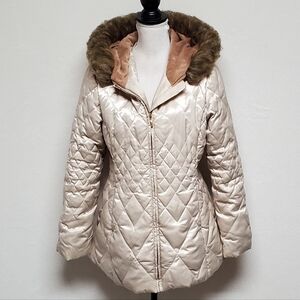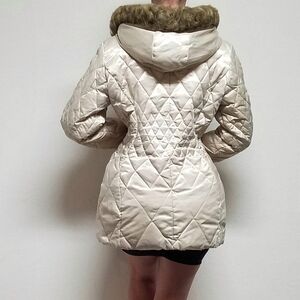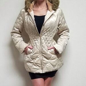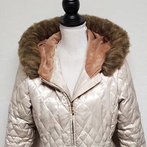Vintage 90s Liz Claiborne Pearl Faux Fur Fleece Lined Hooded Down Parka Jacket.