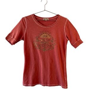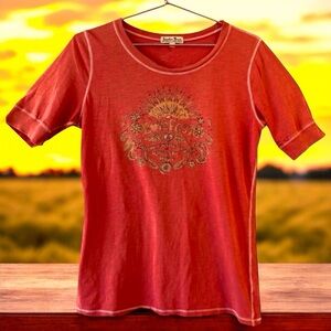 Retro vibes only This soft-faded, orange Lucky Tees top is giving Woodstock meets early 2000s mall goth. Features floral and guitar graphics front & back with contrast stitching for that perfect lived-in look.