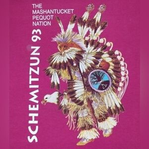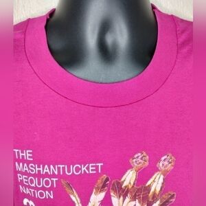 Vintage 90s Pequot Nation Pow Wow Tee Adult Large T-shirt Single Stitch Made In USA Fruit Of The Loom Best 1993 Tag Crew Neck Short Sleeve Graphic Print Pink 50/50 Cotton Blend. No Pet/Smoke Odors *Has Bleach Stain Both Side & Spot(see photos please highlighted), Otherwise Minor Usage Wear But Good Shape Clean. 21.5" Pit To Pit 28.5" Long. Condition Is "Pre-Owned".