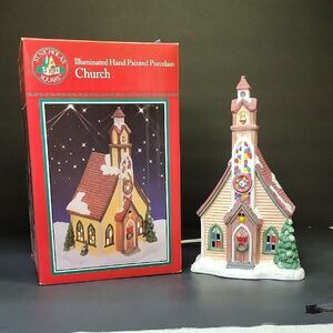 This vintage 90s St. Nicholas Square "Church" porcelain lighted building is a charming collectible for holiday and seasonal decor. Made of high-quality porcelain, this intricately detailed building features a nostalgic design that harkens back to a bygone era. Perfect for adding a touch of classic Christmas cheer to any village or house setting, this rare piece is sure to be a standout in any collection.