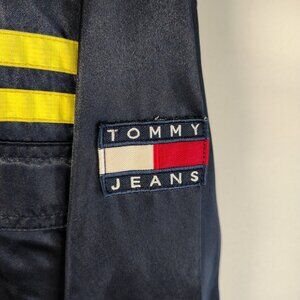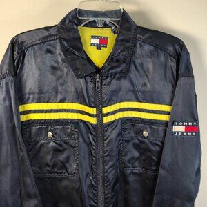 VINTAGE 90s Tommy Hilfiger Jeans Jacket Navy Yellow Striped Satin Full Zip